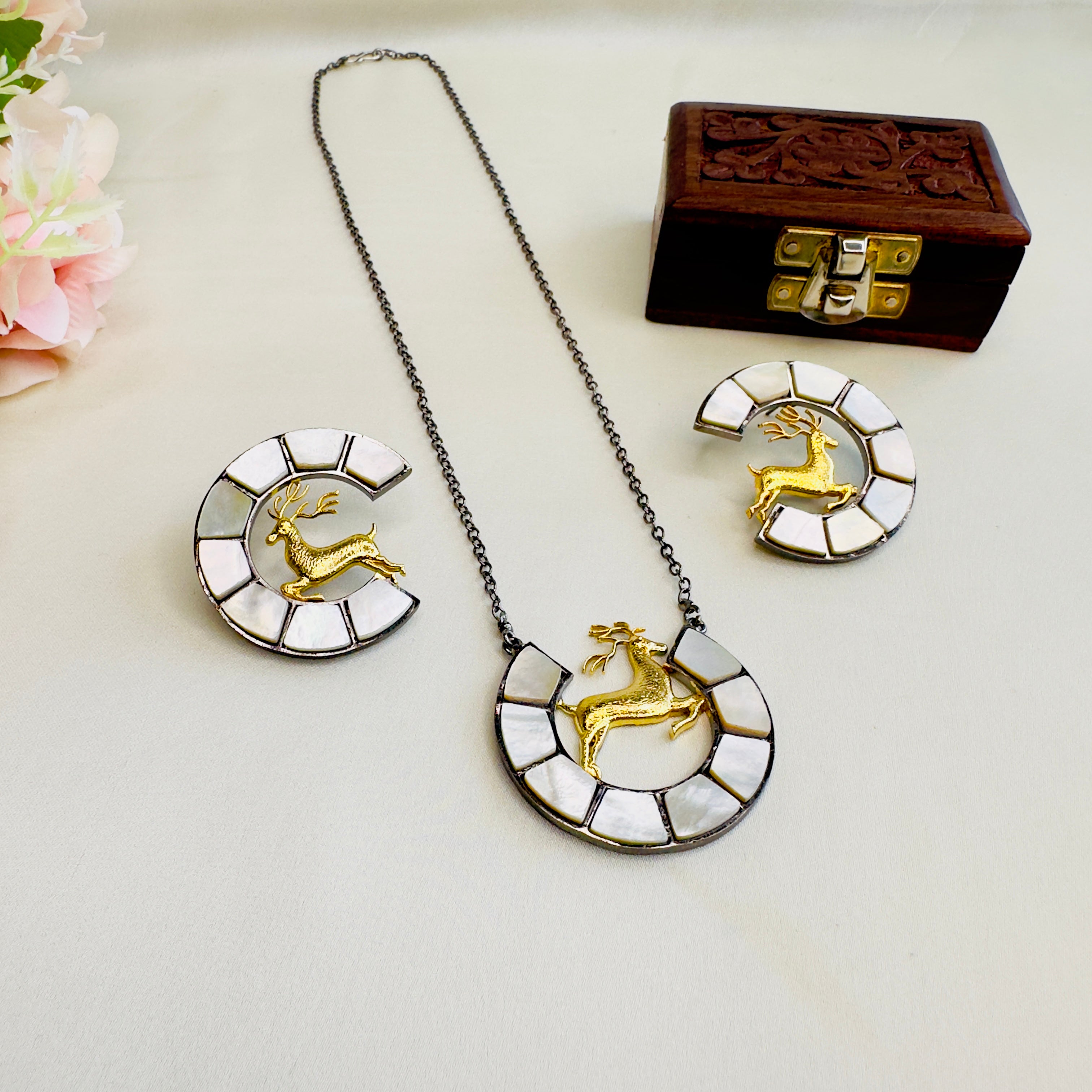 Deer Motif Mother of Pearl Chain Pendant Set