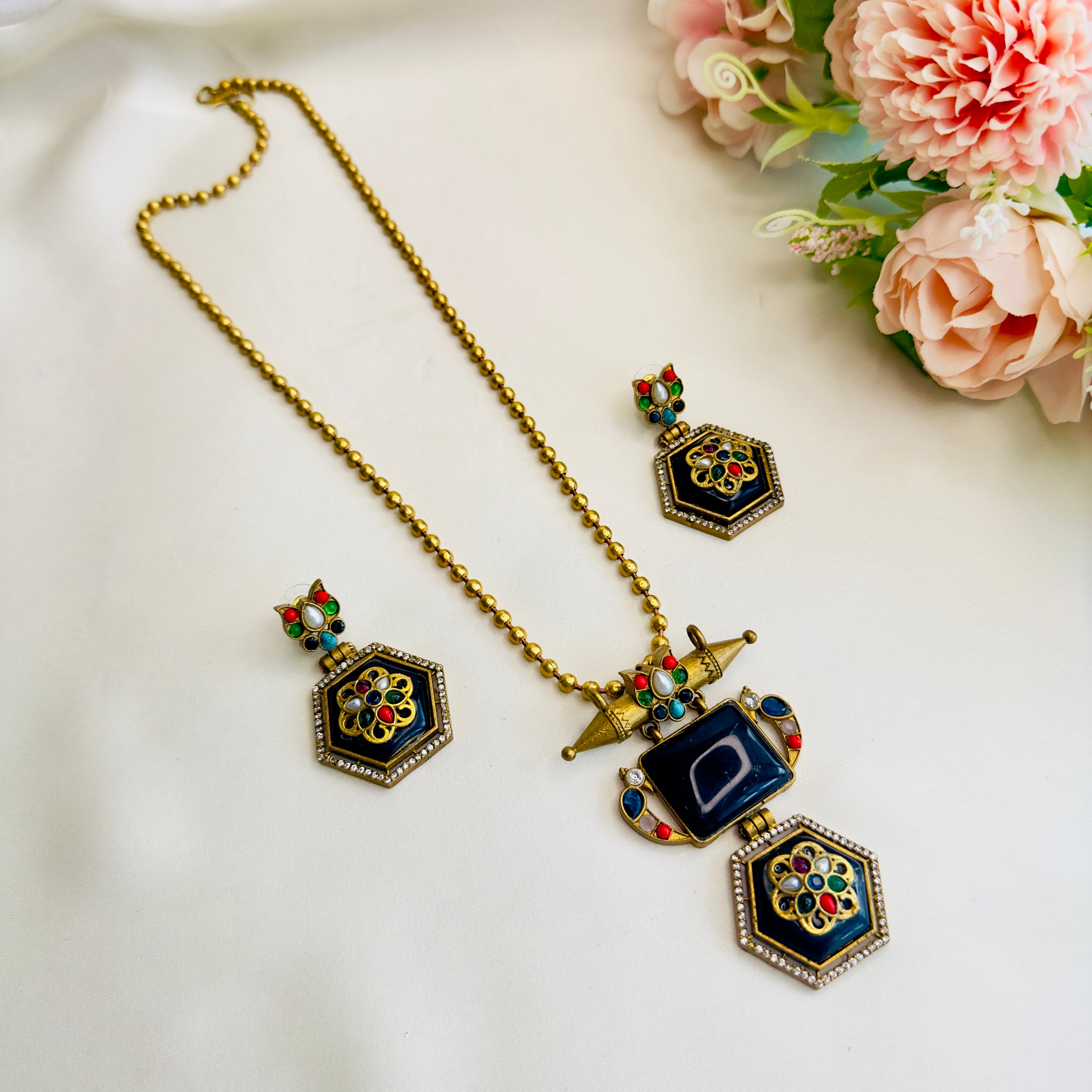 Apala Polish Inlay work black Monalisa Necklace Set