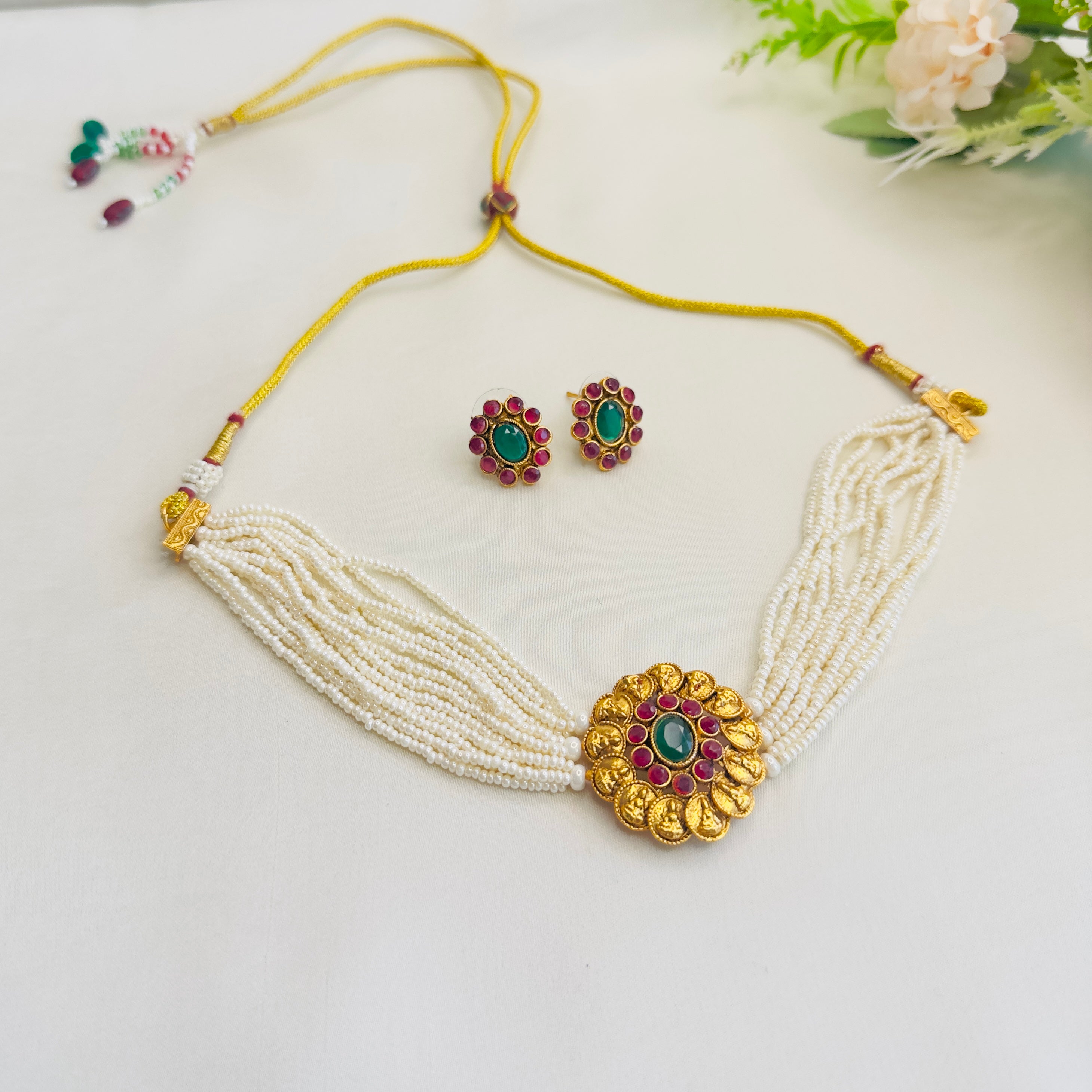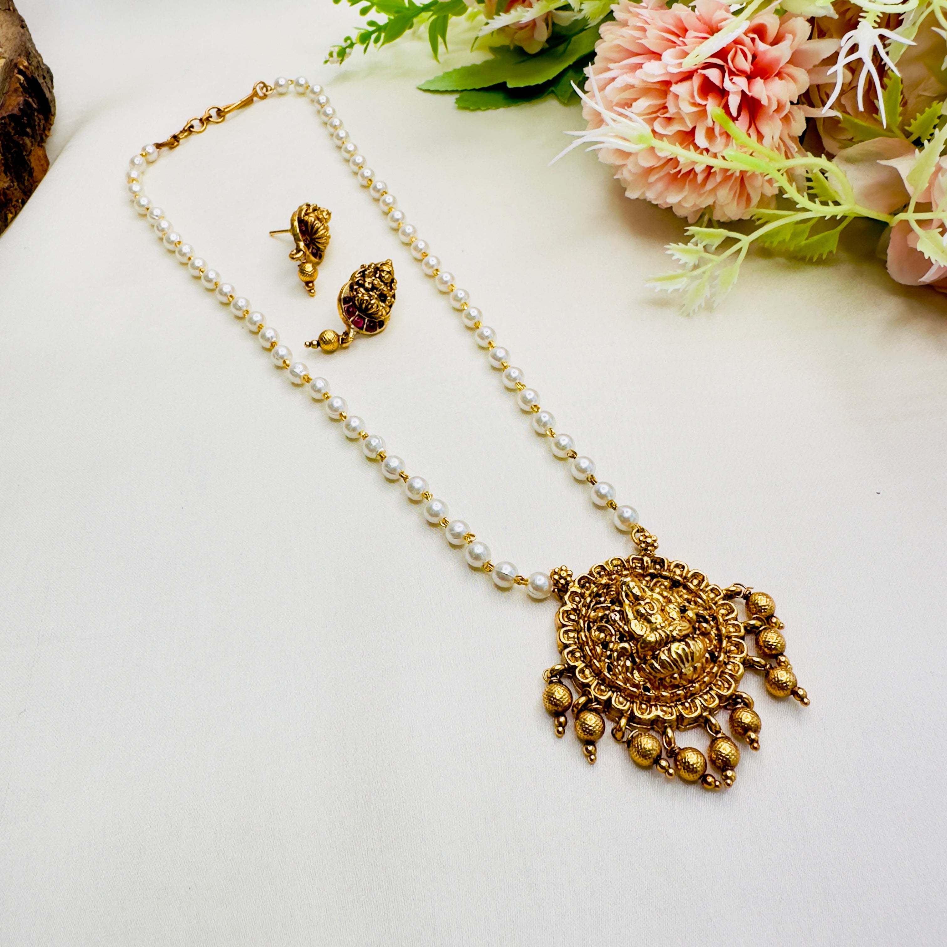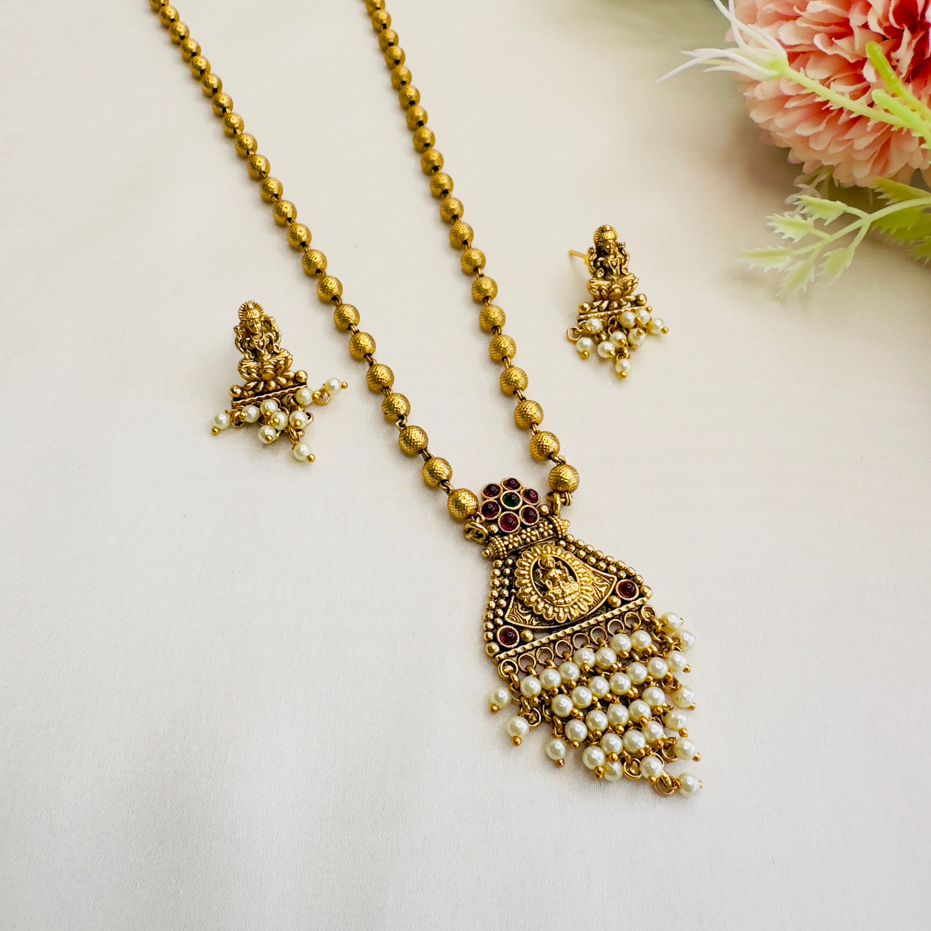 Lakshmi Motif Pendant Pearl Mala Necklace Set