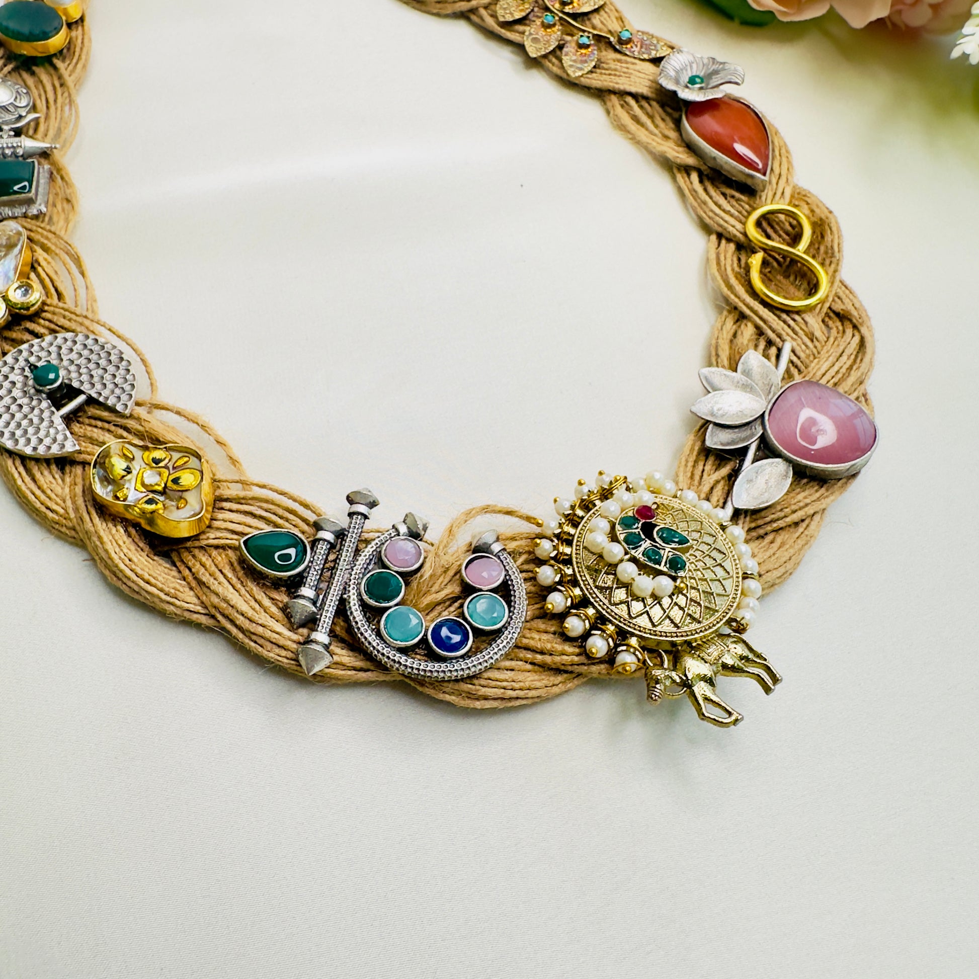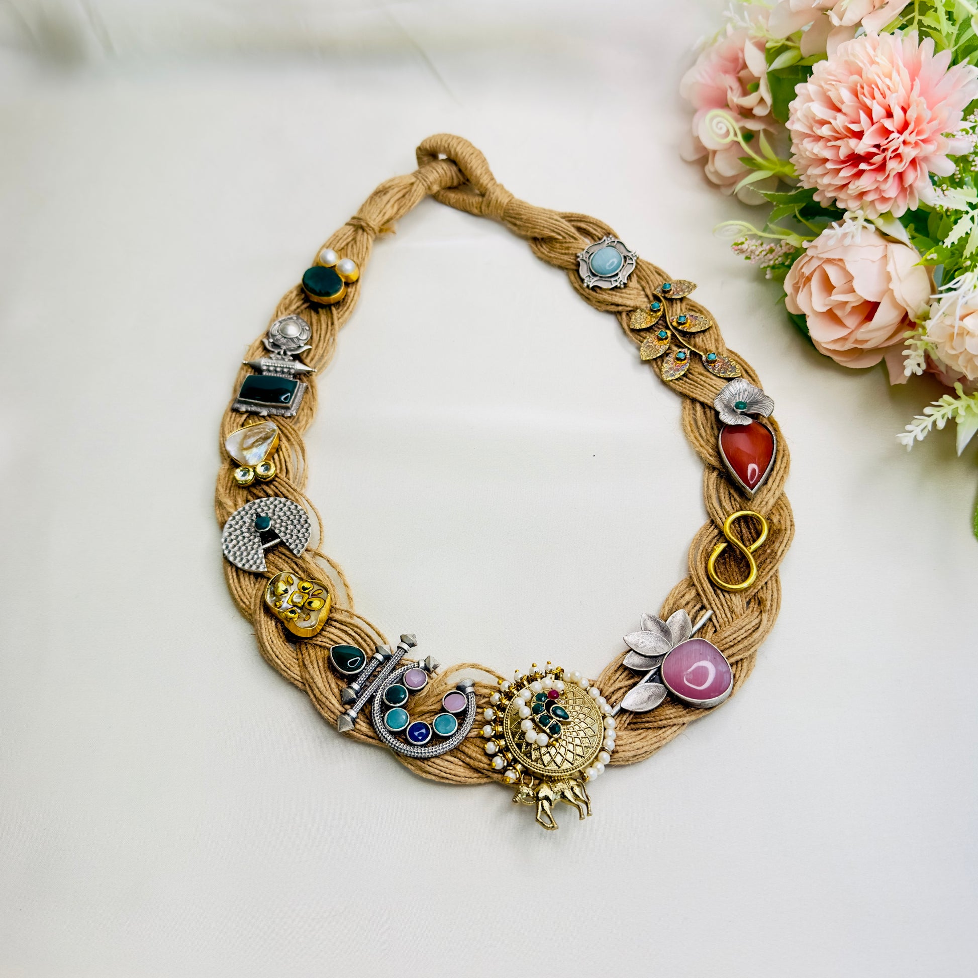 Dual Tone Silver Replica Jute Long Necklace